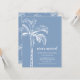 Faire-part tropicale mobile avec un palmier posé sur un arrière - plan bleu avec un dos assorti.