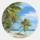 Autocollant photo rond avec un palmier suspendu sur une plage de sable blanc d'une île tropicale dans l'océan Pacifique appartenant à l'archipel de Tahiti Polynésie française.