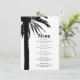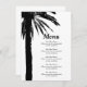 Palmier tropical menu mariage modèle. Elégant modèle pour une soirée de mariage raffinée en bord de mer. Belle silhouette feuille de palme noire avec typographie stylée. Modèles personnalisables pour les couples qui se marient. Partie d'un bel ensemble de correspondances.