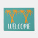 Plage de palmiers Tapis d'accueil à thème été avec palmiers oranges sur le thème de la plage contre arrière - plan bleu personnalisable avec panneau d'accueil. Un tapis de porte de bienvenue à l'ambiance estivale pour votre maison.