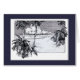 Carte d'art vierge au vent du Sud tropical oeuvres vintages de palmiers sur une plage de sable et de beaux nuages sur des vagues océaniques calmes sur un arrière - plan texturé bleu foncé. Cliquez sur Customiser pour ajouter votre nom ou votre message.