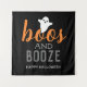 Pancarte de fond de tapisserie pour soirée Halloween moderne et mignonne "Boos and Booze" avec texte en lettrage orange, gris charbon et blanc avec un petit accent de fantôme.