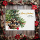 Sur cette carte de vacances, un adorable chien du Yorkshire Terrier repose dans son lit en osier devant un sapin décoré. Derrière le panier se trouve un joli bouquet de baies rouges et de cônes de pins. Le texte en or à droite dit "MERRY CHRISTMAS", avec HAPPY NEW YEAR en vert en dessous. Tout le texte, à l'intérieur et à l'extérieur, peut être facilement changé à tout ce que vous voulez. Vous pouvez voir plus d'images et de produits pour chiens à Dog Village.