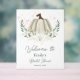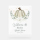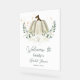 Accueillez vos invités à votre jour spécial avec ce panneau de fête de mariage automnal, avec une verdure de citrouille blanche et une écriture calligraphique élégante verte. Le panneau de bienvenue parfait pour une fête de mariage avec des citrouilles blanches pour la décoration de mariage automnal.
