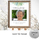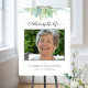 Mes condoléances pour votre perte. Honorez votre proche avec un panneau de bienvenue photo de funérailles délicat et attentionné avec un design de verdure aquarelle peint à la main exquis en haut et la phrase "Célébrer la vie de" en calligraphie moderne gracieuse. Choix de plusieurs tailles. Feuillage vert et taches aquarelles dans des teintes turquoise pâle, bleue et verte. Faire-part de funérailles/célébration de vie, livre d'or, cartes de remerciement et programme coordonnés disponibles. Fait partie de notre collection "Funérailles délicates, Mémorial".