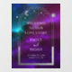 Panneau de bienvenue Mariage Univers Ciel Étoiles Lune Soleil Violet Turquoise. Le design comporte des motifs argentés de soleil, lune et étoiles avec un cadre argenté sur un fond cosmique coloré violet, turquoise et bleu. À l'intérieur du cadre se trouve votre texte personnalisé en élégante calligraphie blanche. Conçu pour vous par ©2024 Evco Studio www.zazzle.com/store/evcostudio