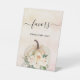 Un fond dégradé rose doré et rose poudré, une citrouille couleur crème et des fleurs. Texte : Faveurs, veuillez en prendre un.