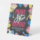 Il est temps de peindre et de relâcher ! Donnez un petit quelque chose à votre équipe nuptiale pour se souvenir de leur peinture amusante et la fête de sip avec une peinture et sip party signe de bienvenue guéridon piédestal. Il suffit de customiser avec le nom de la mariée et la date de la fête pour une sensation personnelle amusante. Le design comprend la typographie "peinture sip Repeat" ainsi que des plaques de peinture avec des plaques de peinture jaune, rouge et bleu, ainsi que la palette de peinture peinte à la main, la brosse de peinture et le verre contre un arrière - plan de tableau noir.