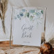 Ce panneau de livre d'or à feuillage aéré et feuille d'or est parfait pour un mariage moderne. Le design botanique élégant présente un eucalyptus aquarelle léger et aéré accentué de feuilles de glitter doré fantaisistes.