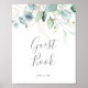 Ce panneau de livre d'or avec feuillage aérien et feuille d'or est parfait pour un mariage moderne. Le design botanique élégant présente un eucalyptus aquarelle léger et aérien accentué de feuilles de glitter doré fantaisistes.