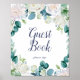 Ce panneau de livre d'or à fleurs blanches classiques est parfait pour un mariage printanier. Le design floral élégant présente des roses, des pivoines et des chrysanthèmes ivoire et blancs doux avec des touches de fleurs de peinture aquarelle bleue pervenche et de feuillage vert.