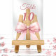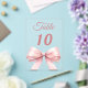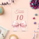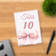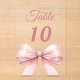 Personnalisez et vos numéros de table un par un. Un fond clair orné d'un grand nœud de couleur rose.