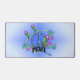 Ce tapis de bureau a un design abstrait de signe de paix bleu de couleur vive avec des rouleaux verts et bleus et des étoiles de tournage rose avec le texte Paix sur fond foncé à arrière - plan bleu clair.