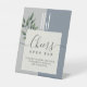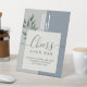 Élégant, moderne, simple, enseigne de table de bar ouvert de mariage bleu poussiéreux botanique, avec des initiales de monogramme géantes et de la verdure à l'aquarelle.