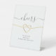 Élégant, simple panneau de table de mariage blanc Cheers avec un cœur de corde doré faux et écriture calligraphique moderne.