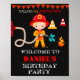 Panneau de réception pompier affiche pompier. Ce panneau de réception pompier est parfait pour accueillir vos invités à votre fête pompier! Sympa signe de fête pour la fête d'anniversaire du jeune pompier avec un garçon de pompier blond avec un tuyau d'incendie et du matériel de lutte contre l'incendie. Sonnez l'alarme et éditez simplement ce modèle facile à utiliser dans le menu Personnalisation.