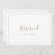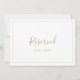 Ce panneau minimaliste réservé en or est parfait pour un mariage simple. La carte est recto-verso (imprimée des deux côtés). Le design romantique moderne présente une typographie classique or et blanche associée à une calligraphie rustique mais élégante avec un style de lettrage à la main vintage. Personnalisable dans n'importe quelle couleur. Gardez le design simple et élégant, tel quel, ou personnalisez-le en ajoutant vos propres graphiques et illustrations. Utilisez ces cartes pour réserver des chaises ou des tables lors de votre cérémonie de mariage, réception ou tout événement.