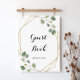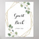 Ce panneau de signature de livre d'or à calligraphie géométrique dorée est parfait pour un mariage rustique ou une baby shower. Le design présente des branches et des feuilles de eucalyptus vert botanique dessinées à la main ornant un cadre élégant.