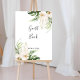Ce panneau de signature du livre d'or floral à feuillage tropical or est parfait pour un mariage rustique ou une douche de mariée. Le design présente un feuillage doré et vert tropical peint à la main à l'aquarelle avec des fleurs roses élégantes.