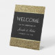 Un panneau de piédestal de table de bar ouvert chic et élégant, fabriqué avec un design luxueux pailleté or, noir et blanc, accentué d'une écriture calligraphique moderne.