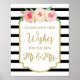 Veuillez laisser vos souhaits pour le nouveau Mr. & Mme signe pour mariage en rayures noir et blanc motif, cadre vintage or glamour, fleurs vintages rose et pêche et texte de style lettré à la main.