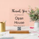 Merci d'être venu à notre Open House. Veuillez analyser pour vous connecter. Ce sont les mots qui apparaissent actuellement au-dessus de l'image de code QR. Vous pouvez modifier le texte d'affichage noir pour afficher un message personnalisé si vous le souhaitez. La ligne supérieure est un script élégant qui dit Merci. Le reste du texte n'est pas un script. Un code QR se trouve en bas pour que vos invités puissent scanner pour se connecter. N'oubliez pas d'entrer votre site web pour que le code QR fonctionne correctement.
