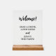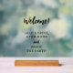 Élevez votre événement spécial avec un panneau clair rectangulaire en acrylique présentant l'inscription ludique « Bienvenue - Prenez un verre, quelques bouchées - et - Profitez de la fête ! » dans un élégant script noir sur un fond transparent. Ce panneau permet la personnalisation ou la personnalisation du message, ce qui le rend idéal pour les mariages, les fêtes, les fiançailles, les baby showers, les anniversaires et au-delà. Il peut également être accompagné d'une base en bois naturel solide pour une présentation simple et autonome, complétant les tables de mariage et la décoration de l'événement sans effort.