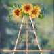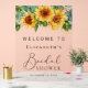 Panneau de bienvenue en acrylique transparent pour réception de mariage champêtre, avec un bouquet aquarelle de fleurs de tournesol et de verdure d'eucalyptus, une écriture calligraphique chic et une typographie serif élégante.