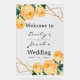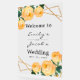 Mariage de bienvenue Parties scintillant or Geo Orange Floral Acrylique Signal (24"x36"). Des panneaux plus petits sont disponibles. Le design se compose d'un élégant motif géométrique de parties scintillant en faux or, de roses orange aquarelle et de feuillage vert sur deux coins. Personnalisez ce modèle pour ajouter vos informations. Un grand accueil à notre signe mariage à la cérémonie et à la réception. Tout est personnalisable lorsque vous personnalisez ou éditez.
