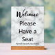 Ce panneau d'entreprise dit Bienvenue S'il vous plaît, prenez place Nous serons avec vous sous peu. Tout le texte est noir et peut être modifié. L'accueil est dans un script élégant. Le panneau a un faux arrière - plan en marbre blanc.