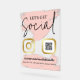 Acrylique obtenons le signe social avec les touches rose-rousse imprimées, votre code QR et l'icône faux or des médias sociaux personnalisées avec votre poignée de médias sociaux. Panneau promotionnel des médias sociaux avec polices noires et traits de peinture rose vif imprimés sur un arrière - plan acrylique personnalisé avec votre code QR afin que vos clients et clients puissent facilement accéder à vos médias sociaux.