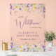 Un élégant panneau d'accueil en acrylique clair pour bébé avec "un petit fleur sauvage est en route" écrit dans un mélange de typographie gris clair et d'un script violet élégant, et des aquarelles blanches d'inspiration boho de fleurs sauvages mauve, rose et jaune. Ajoutez le nom de la mère-à-être en lettres simples violettes.