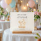 Perfect for baby showers and new baby celebrations, this editable acrylic sign features neutral boho tones and a charming teddy bear design.