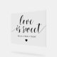 L'amour est sucré ; prenez un régal ! Ajoutez un accent mignon à votre paysage de table d'évènement avec ce panneau acrylique de la barre des desserts. Il présente une calligraphie géologique. Personnalisez en ajoutant vos détails. Cette enseigne dessert bar est parfaite pour les mariages, les douches nuptiales, les baby showers et autres événements.
