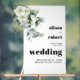 Bienvenue dans votre mariage avec ce charmant panneau acrylique. Il présente un cadre blanc et des branches d'eucalyptus avec fleurs blanches et feuillage vert sauge sur le coin supérieur gauche. Le bord gauche du panneau est transparent, tandis que la typographie audacieuse chaudement invitations participants pour célébrer votre union.