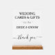 Les cartes mariages modernes et les cadeaux pour la mariée et le marié sont écrits en typographie noire dans différentes polices contre l'arrière - plan blanc. Affichage minimaliste de la table d'accueil de mariage. Le Merci est écrit en blanc. Dessins de TamiraZDesigns.