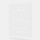 Un panneau minimaliste d'accueil mariage blanc avec un élégant script de calligraphie, imprimé sur de l'acrylique transparent. Customisez les couleurs correspondant à votre thème.