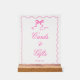 Célébrez votre fête prénatale avec style grâce à notre panneau en acrylique Cartes et cadeaux à ruban rose, avec mes illustrations originales avec un ruban, une bordure ondulée et une typographie élégante. Ce panneau de bienvenue fantaisiste est personnalisable et vous permet de modifier tous les détails, y compris le texte, la couleur de fond, la couleur de l'illustration, et plus encore, pour correspondre à votre thème de fête.