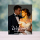 This elegant custom photo wedding welcome sign features a premium photo template for uploading your desired engagement or couple portrait in place of the sample image shown. The sophisticated modern handwritten script spells out the word "Welcome" in flowing calligraphy style, perfectly complemented by contemporary typography. Personalise the bride and groom's names to create a wedding welcome sign that is uniquely yours and reflects your love story.
