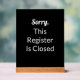 Vous pouvez modifier le texte d'affichage blanc pour créer un message personnalisé pour votre entreprise. Le panneau acrylique noir dit : Désolé, ce registre est fermé. La ligne supérieure du texte affiché est un script.