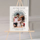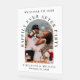 Elégant panneau de réception de mariage en acrylique blanc avec votre photo présentée dans un cadre d'arche chic, "Bienvenue à notre Happily Ever After Party" dans la typographie serif simple et classique, ainsi que vos noms et date de réception.