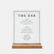 This acrylic sign features a clean, minimalist design with a white background and black text. The layout is organized into three sections—Beer, Wine, and Spirits—each highlighted by bold headings in uppercase serif font, followed by lists of options in a simple sans-serif typeface. The overall style exudes elegance and sophistication, making it perfect for enhancing the ambiance of any bar or home setting. Its straightforward typography and uncluttered composition convey a professional mood, ideal for creating an inviting atmosphere.