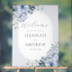 Elégant mariage floral bleu poussiéreux bienvenue acrylique signe. Ce design présente des fleurs d'aquarelle bleu clair et un cadre ovale moderne.