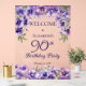 Elegant purple violets floral design "90th Birthday Party" design featuring a floral top and bottom swag of violets with white stardust accents.