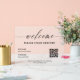 Élégant et simple profitez de notre enseigne acrylique WiFi avec un look imprimé dépoli, polices élégantes, et votre code QR avec le nom de votre WiFi, le mot de passe, et votre médias sociaux, site Web, et hashtag. Signe WiFi personnalisé pour votre salon ou petite entreprise avec l'accueil dans un délicat script de calligraphie et l'information dans une police standard imprimée en noir contre un arrière - plan blanc transparent.