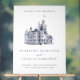 This elegant wedding sign features a vintage illustration of a castle, which you can replace with an image of the destination where you will be married (transparent or white background preferred). Elegant dark blue lettering in serif and script fonts lay out the bride and groom names, and the date.