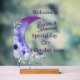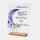Bienvenue à vos invités avec cette magnifique enseigne mariage acrylique avec un croissant de lune violet onirique et un design floral. Personnalisé avec les noms du couple, la date et la ville, il donne un ton romantique à votre journée spéciale. Le socle en acrylique transparent et en bois en fait une pièce élégante et moderne parfaite pour des réceptions, des cérémonies ou des tables d'entrée.