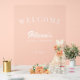 Robe mariage crème or moderne élégante avec bouquets de fleurs beige pêche douche nuptiale signe d'accueil acrylique transparent avec un script de typographie chic.