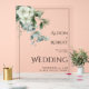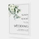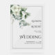 Bienvenue dans votre mariage avec ce joli panneau acrylique. Il présente des branches d'eucalyptus avec des fleurs blanches et du feuillage vert sauge sur le coin supérieur gauche et une bordure noire mince. Le panneau est transparent, tandis que la typographie décorative chaudement invitations participants pour célébrer votre union.