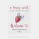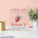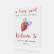 Carte d'invitation baby shower mignonne avec aquarelle illustrant la fraise et l'arc violet. Le texte dit "un bébé doux aux baies est en route." Éléments correspondants disponibles.